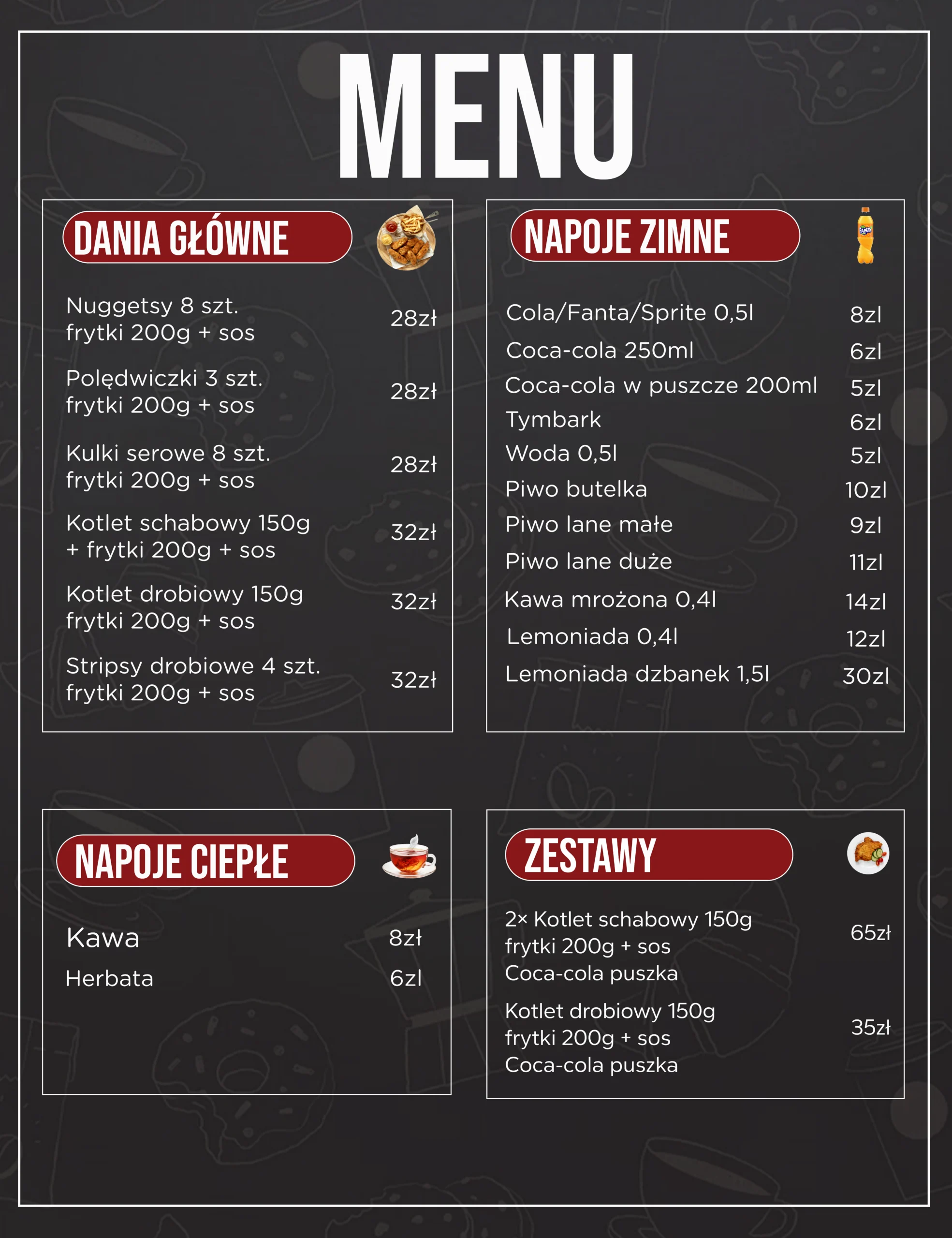 Proste menu z podziałem i delikatnym tłem. Oznaczone spady aby wykonawca za bardzo nie przyciął projektu.